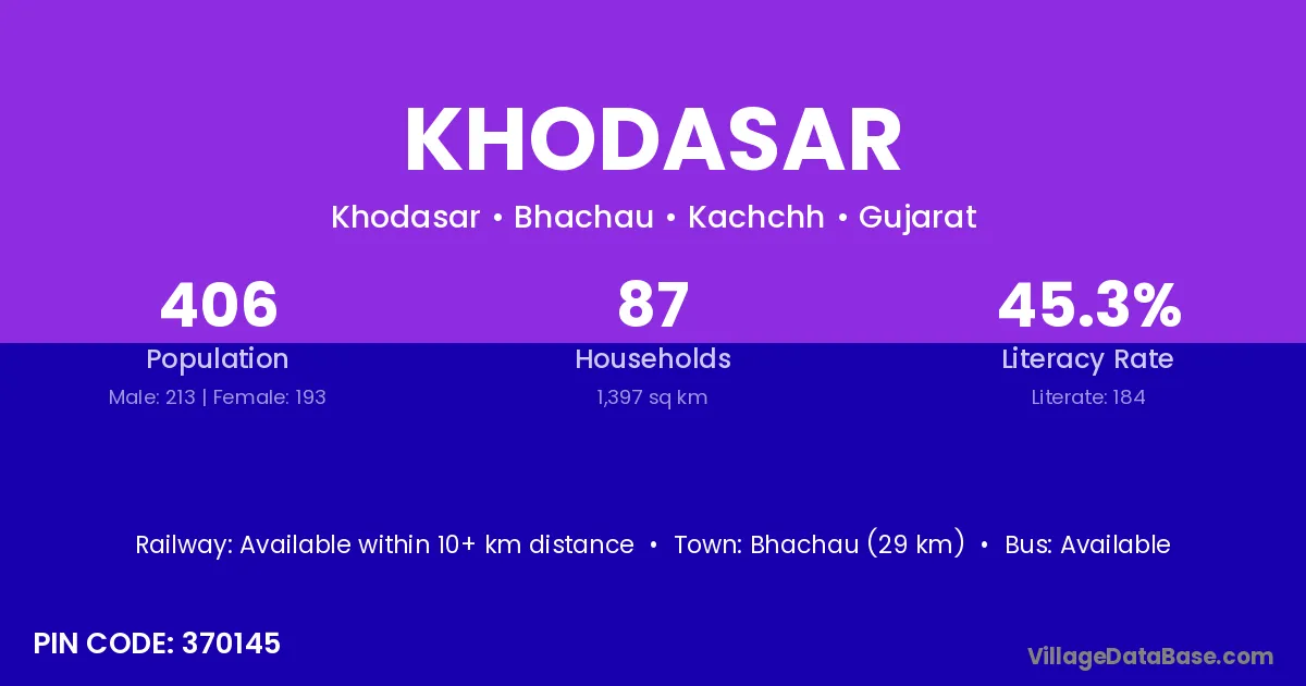 Bhachau (29 km) is the nearest town to Khodasar village for major economic activities and is located approximately 29 km away.