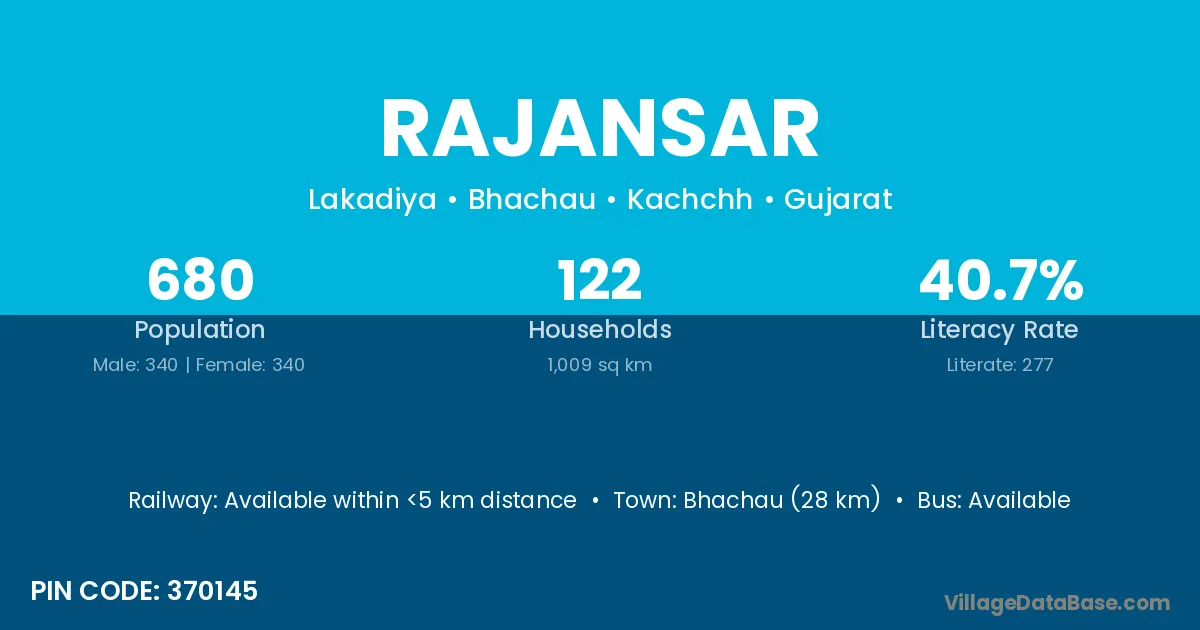 Bhachau (28 km) is the nearest town to Rajansar village for major economic activities and is located approximately 28 km away.