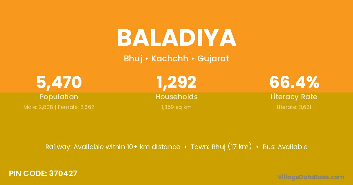 Bhuj (17 km) is the nearest town to Baladiya village for major economic activities and is located approximately 17 km away.