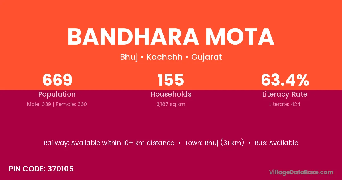 Bandhara Mota village has a total population of 669 people, of which 339 are males and 330 are females.