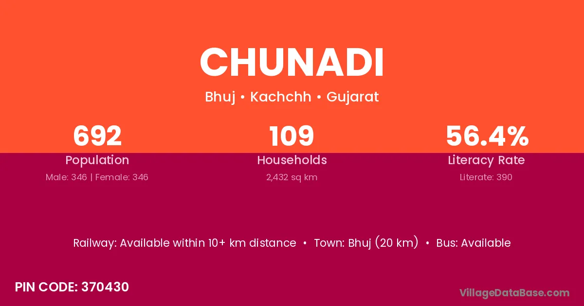 Bhuj (20 km) is the nearest town to Chunadi village for major economic activities and is located approximately 20 km away.
