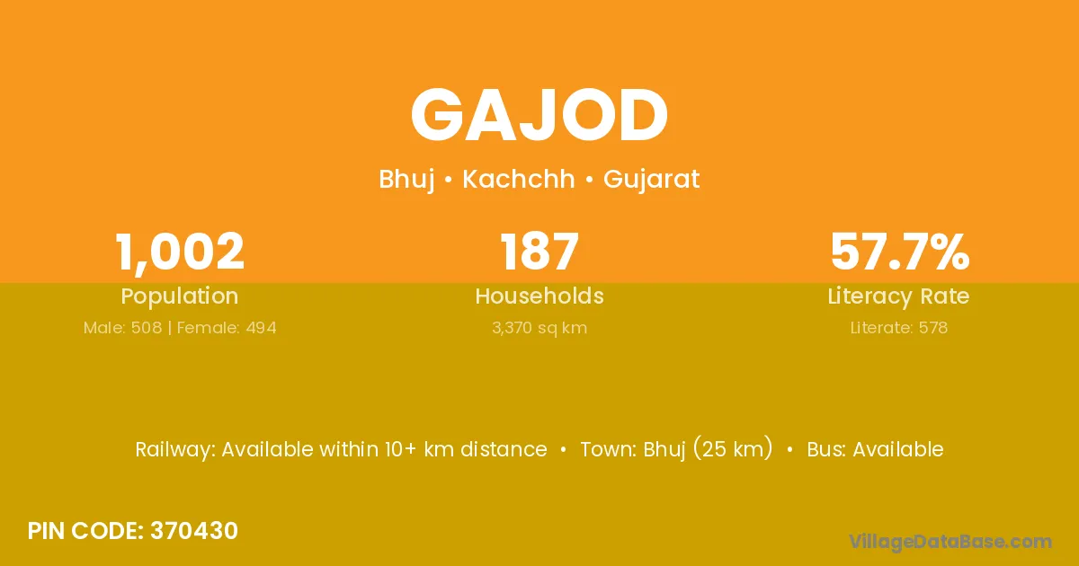 Bhuj (25 km) is the nearest town to Gajod village for major economic activities and is located approximately 25 km away.