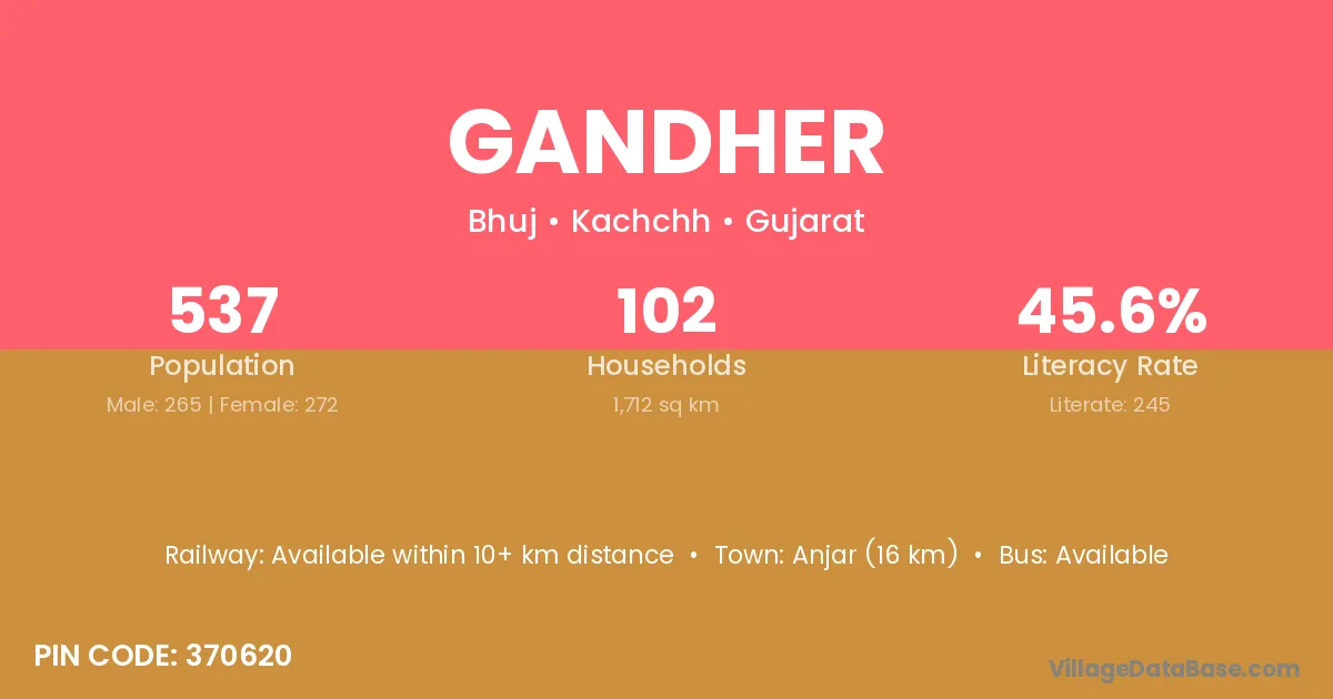 Anjar (16 km) is the nearest town to Gandher village for major economic activities and is located approximately 16 km away.