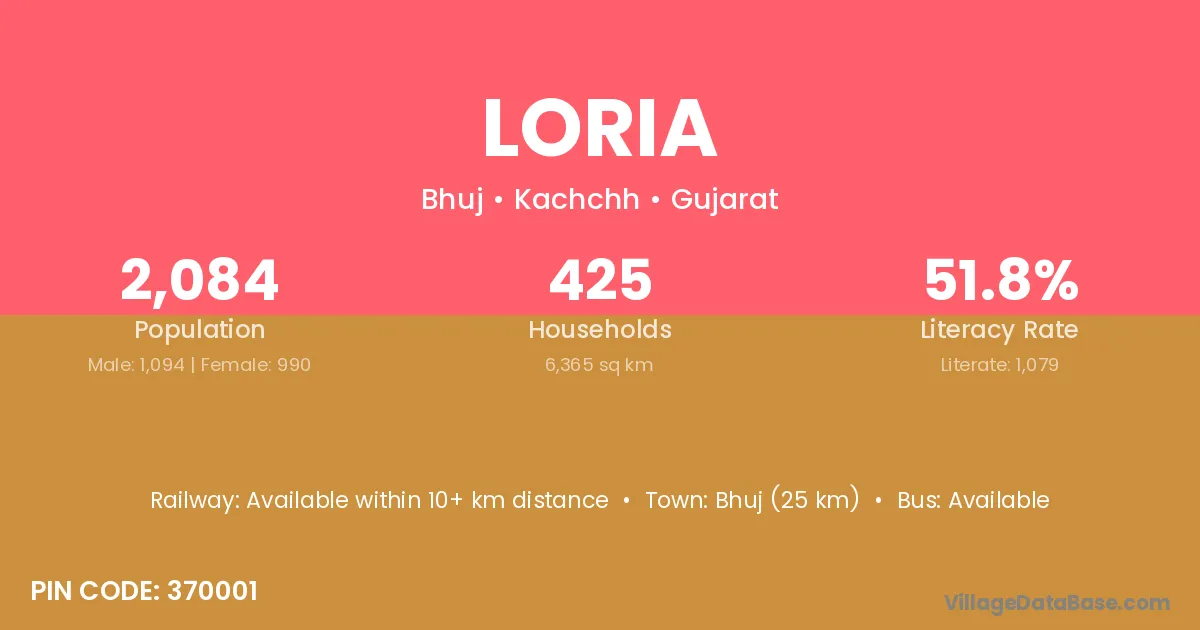 Bhuj (25 km) is the nearest town to Loria village for major economic activities and is located approximately 25 km away.