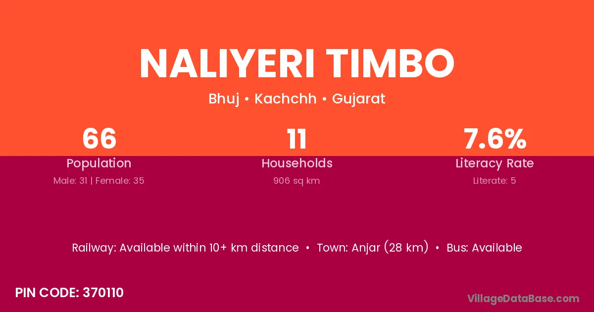 Anjar (28 km) is the nearest town to Naliyeri Timbo village for major economic activities and is located approximately 28 km away.