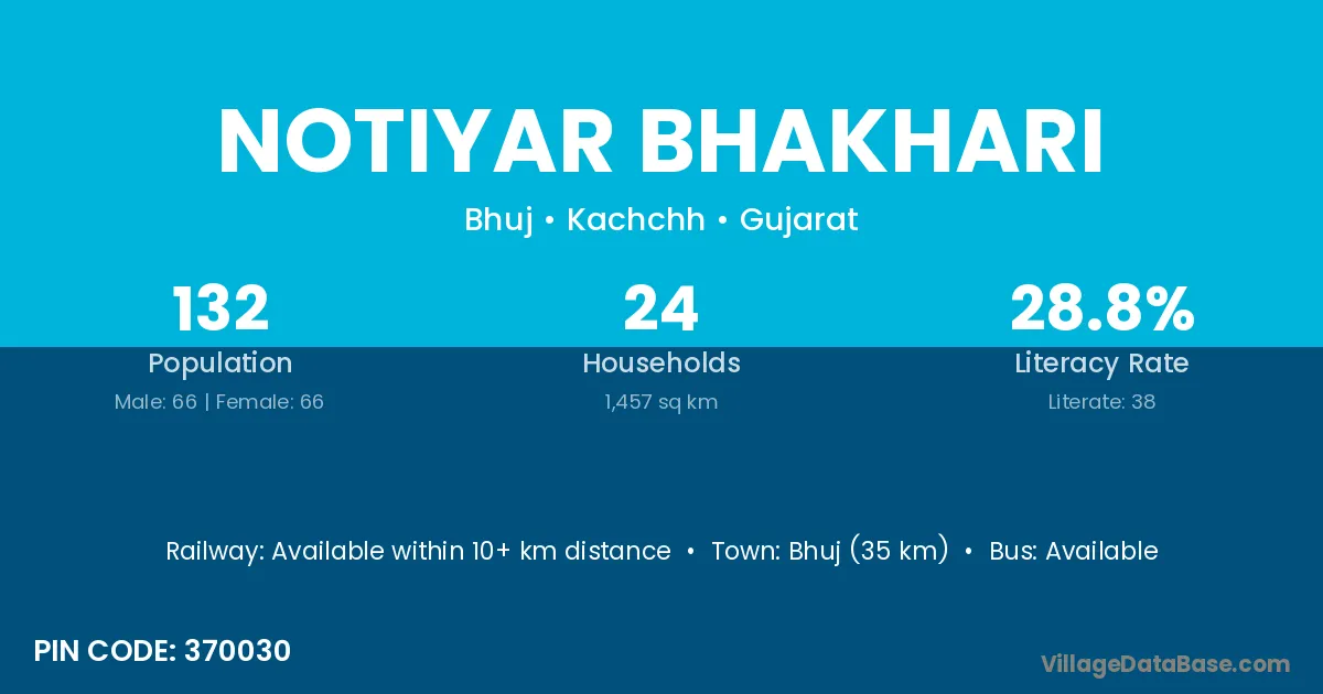 Bhuj (35 km) is the nearest town to Notiyar Bhakhari village for major economic activities and is located approximately 35 km away.