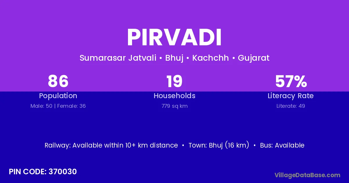 Bhuj (16 km) is the nearest town to Pirvadi village for major economic activities and is located approximately 16 km away.