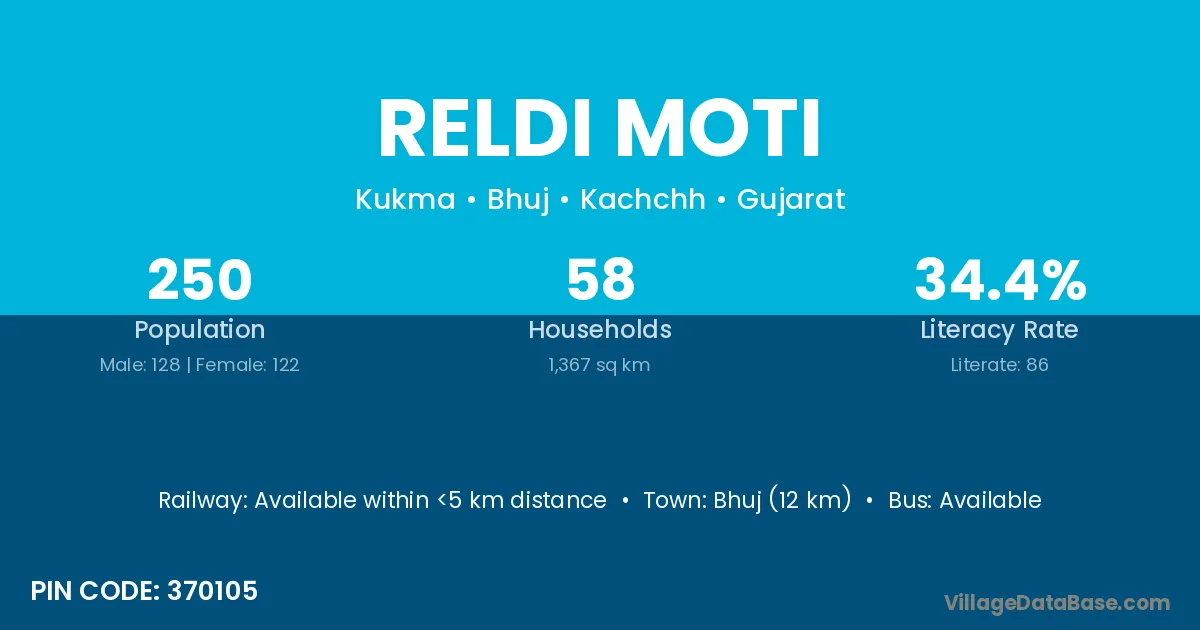 Bhuj (12 km) is the nearest town to Reldi Moti village for major economic activities and is located approximately 12 km away.