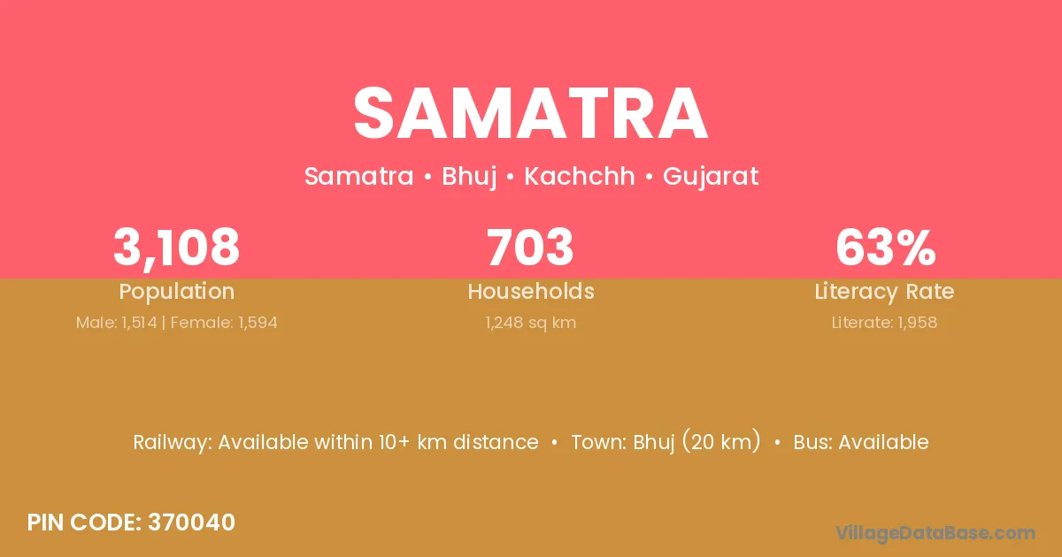 Bhuj (20 km) is the nearest town to Samatra village for major economic activities and is located approximately 20 km away.