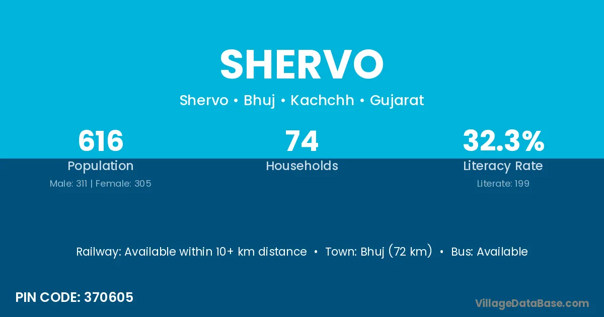 Bhuj (72 km) is the nearest town to Shervo village for major economic activities and is located approximately 72 km away.