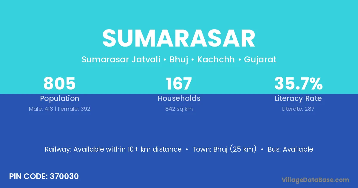 Bhuj (25 km) is the nearest town to Sumarasar village for major economic activities and is located approximately 25 km away.