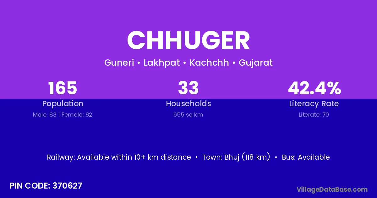 Bhuj (118 km) is the nearest town to Chhuger village for major economic activities and is located approximately 118 km away.