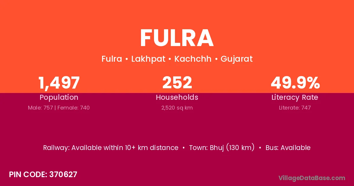 Bhuj (130 km) is the nearest town to Fulra village for major economic activities and is located approximately 130 km away.