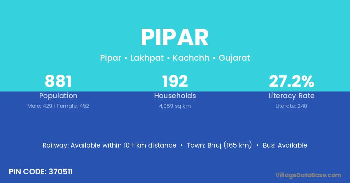 Bhuj (165 km) is the nearest town to Pipar village for major economic activities and is located approximately 165 km away.