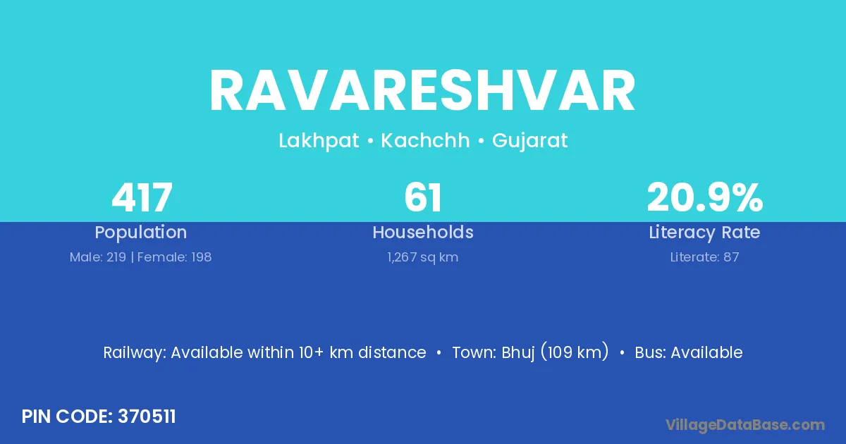 Bhuj (109 km) is the nearest town to Ravareshvar village for major economic activities and is located approximately 109 km away.
