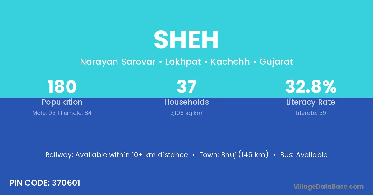 Bhuj (145 km) is the nearest town to Sheh village for major economic activities and is located approximately 145 km away.