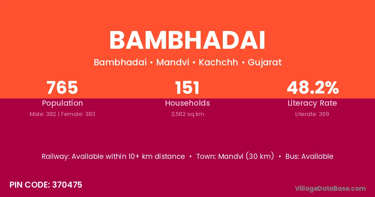 Mandvi (30 km) is the nearest town to Bambhadai village for major economic activities and is located approximately 30 km away.