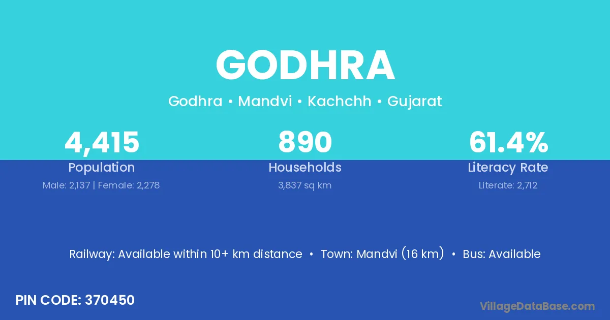 Mandvi (16 km) is the nearest town to Godhra village for major economic activities and is located approximately 16 km away.