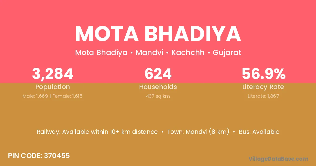 Mota Bhadiya village has a total population of 3,284 people, of which 1,669 are males and 1,615 are females.