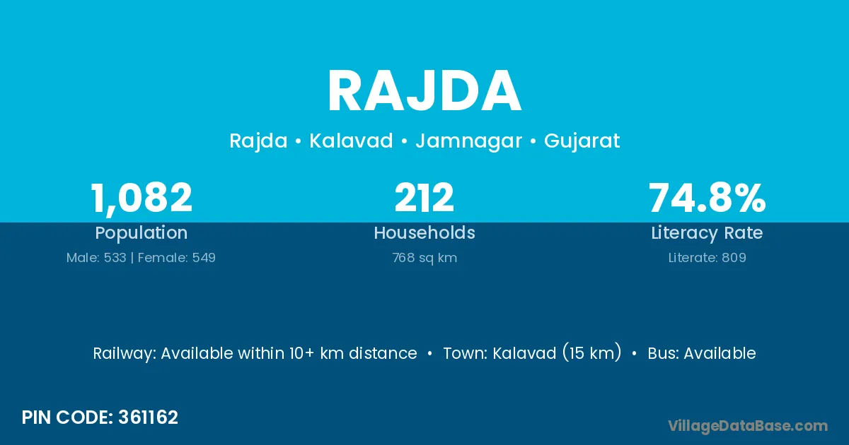 Mandvi (15 km) is the nearest town to Rajda village for major economic activities and is located approximately 15 km away.