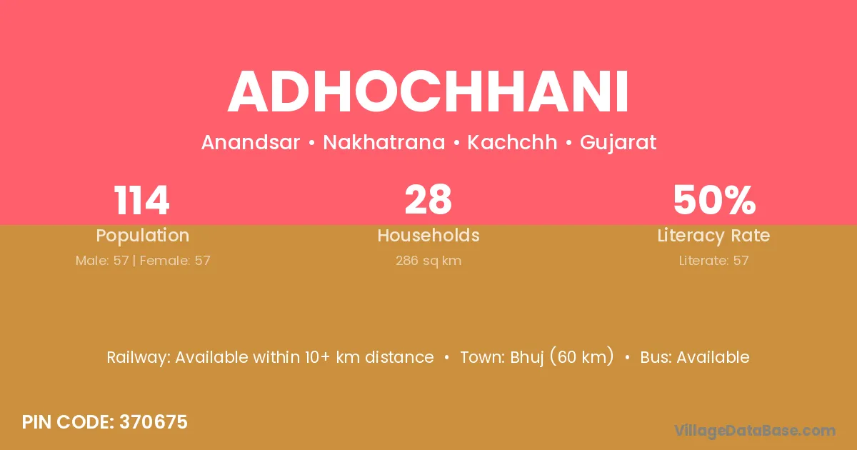Bhuj (60 km) is the nearest town to Adhochhani village for major economic activities and is located approximately 60 km away.