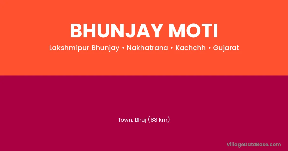 Bhuj (88 km) is the nearest town to Bhunjay Moti village for major economic activities and is located approximately 88 km away.