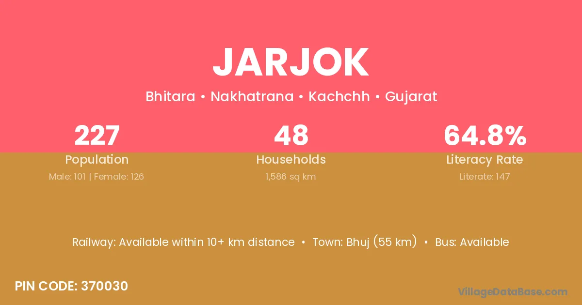 Bhuj (55 km) is the nearest town to Jarjok village for major economic activities and is located approximately 55 km away.