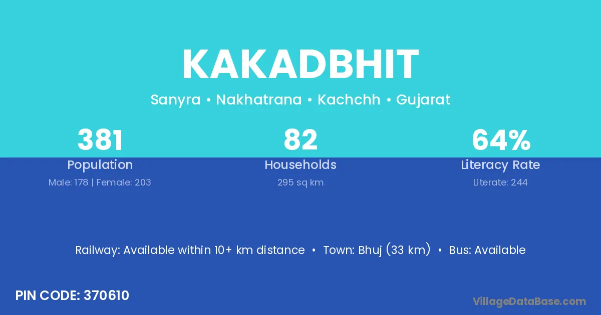 Bhuj (33 km) is the nearest town to Kakadbhit village for major economic activities and is located approximately 33 km away.