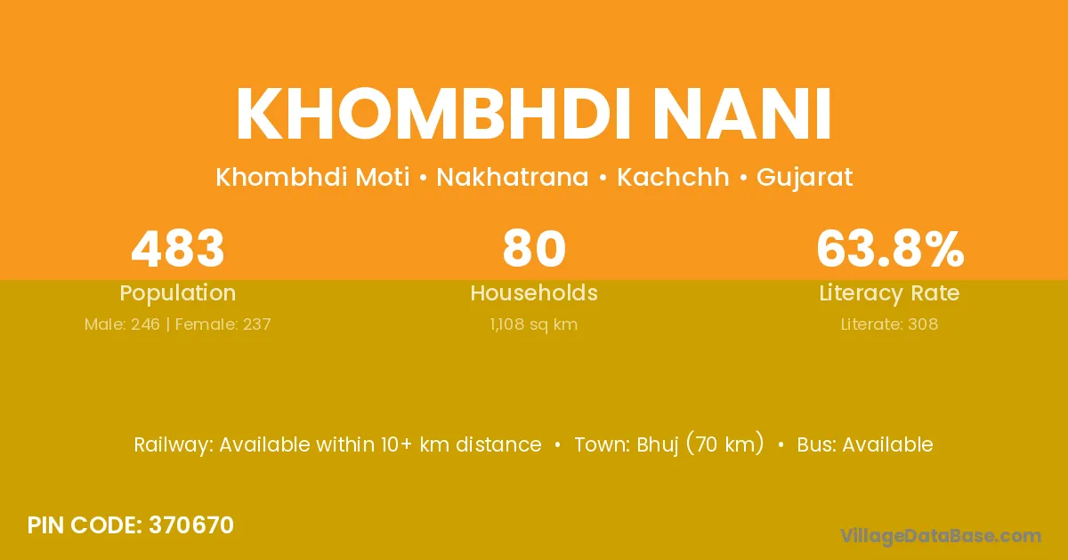 Bhuj (70 km) is the nearest town to Khombhdi Nani village for major economic activities and is located approximately 70 km away.