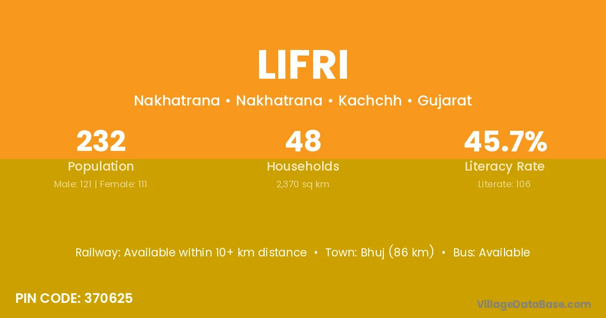 Bhuj (86 km) is the nearest town to Lifri village for major economic activities and is located approximately 86 km away.