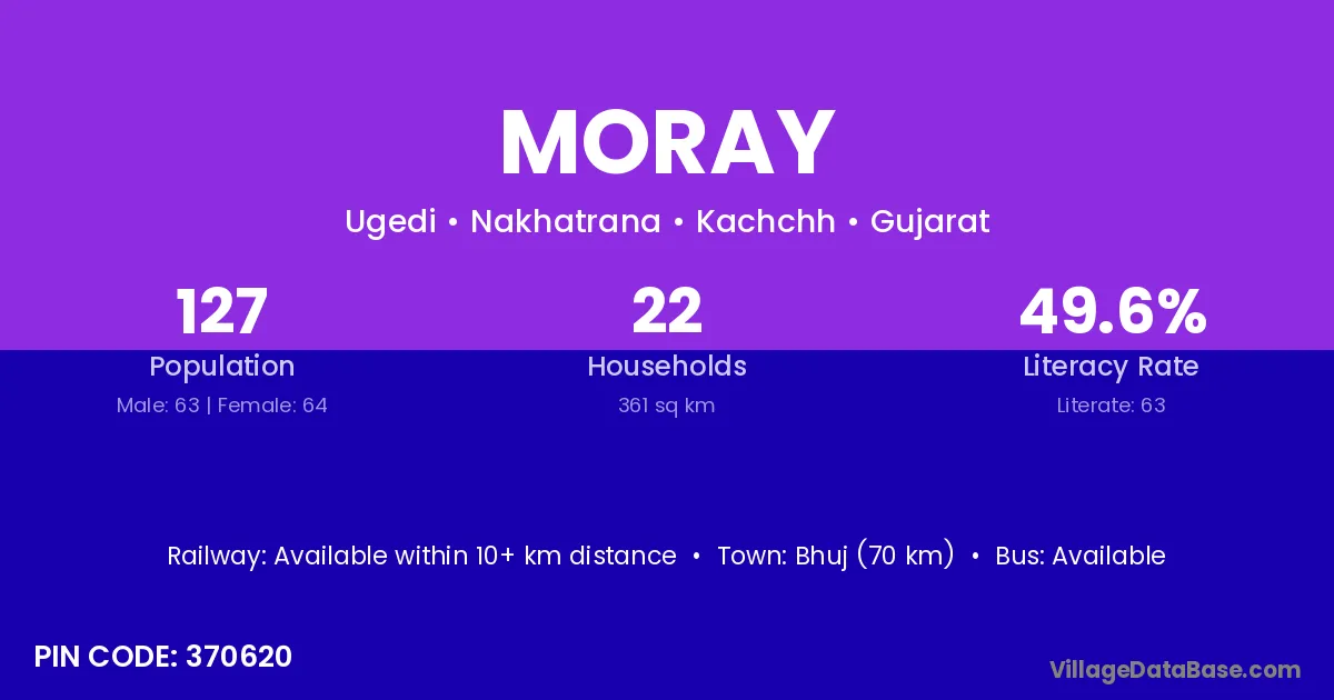 Bhuj (70 km) is the nearest town to Moray village for major economic activities and is located approximately 70 km away.