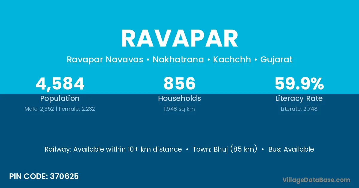 Bhuj (85 km) is the nearest town to Ravapar village for major economic activities and is located approximately 85 km away.