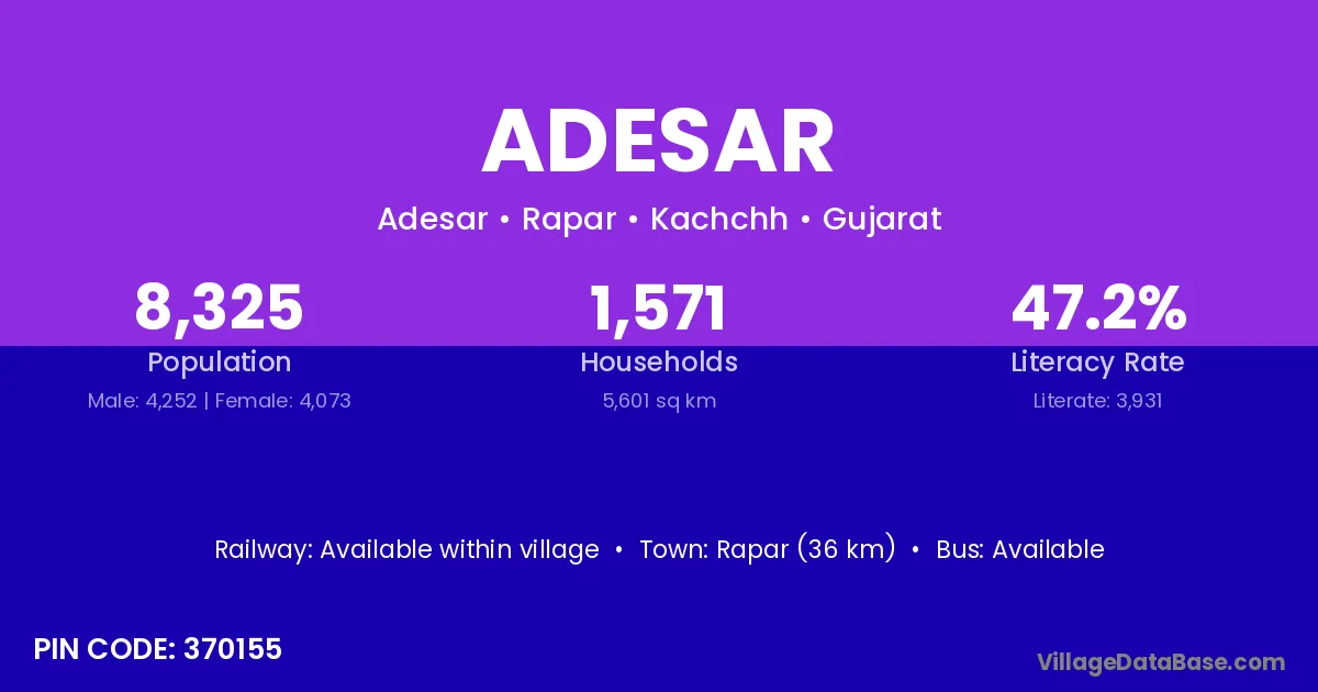 Rapar (36 km) is the nearest town to Adesar village for major economic activities and is located approximately 36 km away.