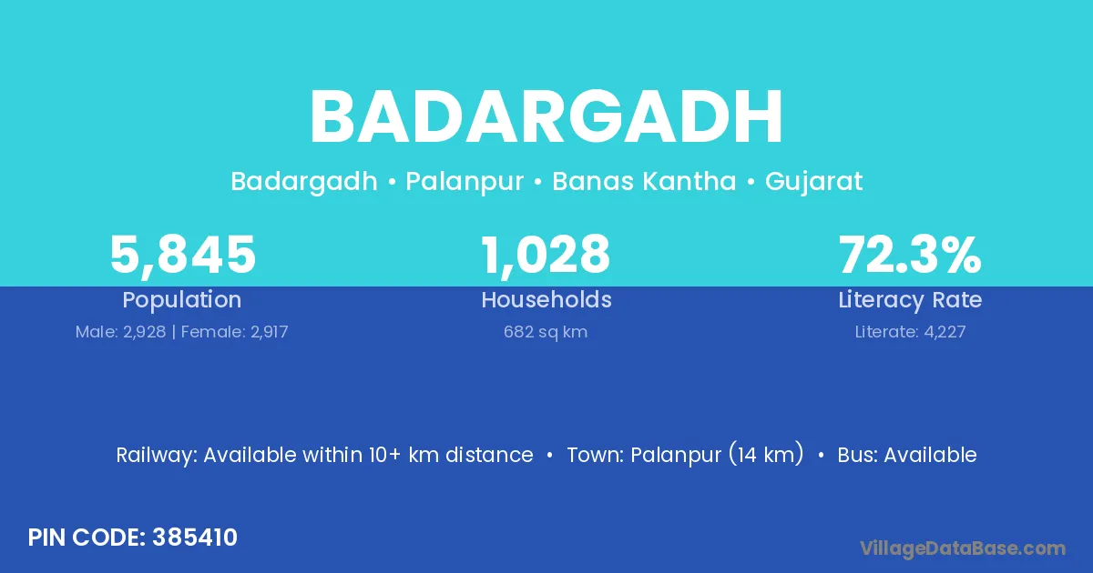 Rapar (17 km) is the nearest town to Badargadh village for major economic activities and is located approximately 17 km away.