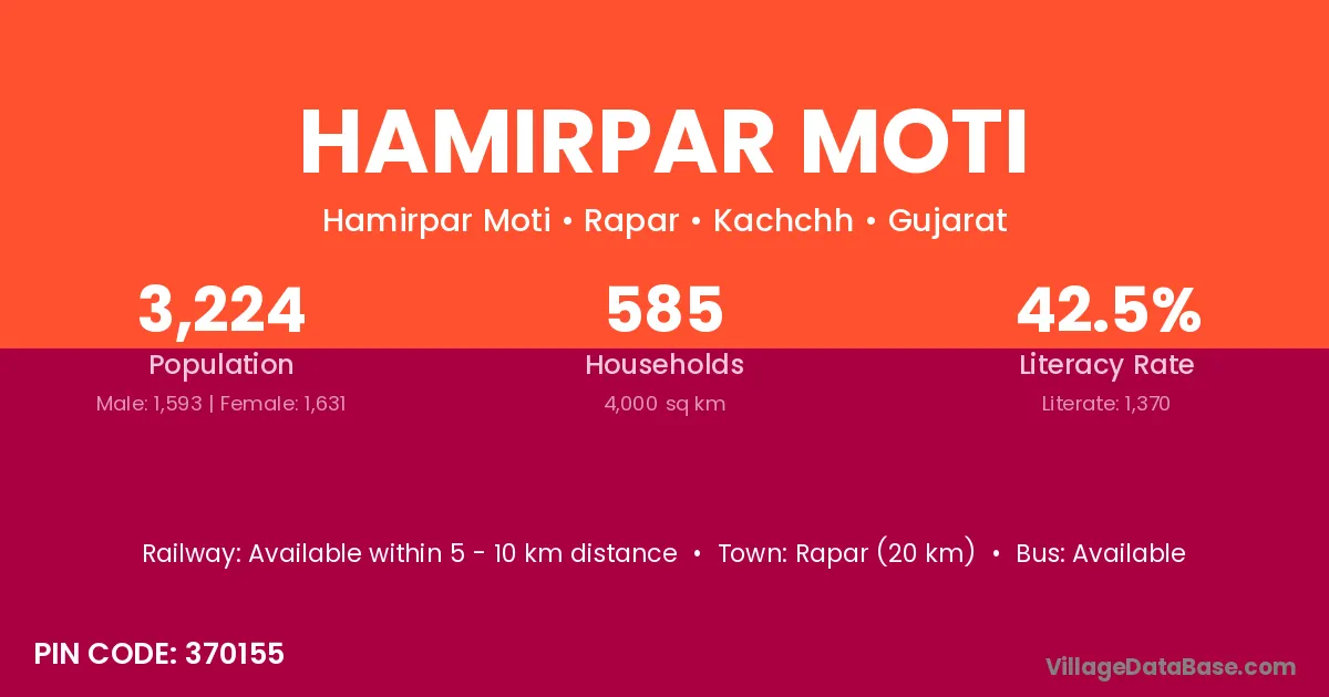 Rapar (20 km) is the nearest town to Hamirpar Moti village for major economic activities and is located approximately 20 km away.
