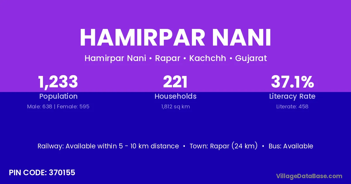 Rapar (24 km) is the nearest town to Hamirpar Nani village for major economic activities and is located approximately 24 km away.