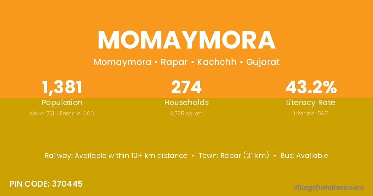 Rapar (31 km) is the nearest town to Momaymora village for major economic activities and is located approximately 31 km away.