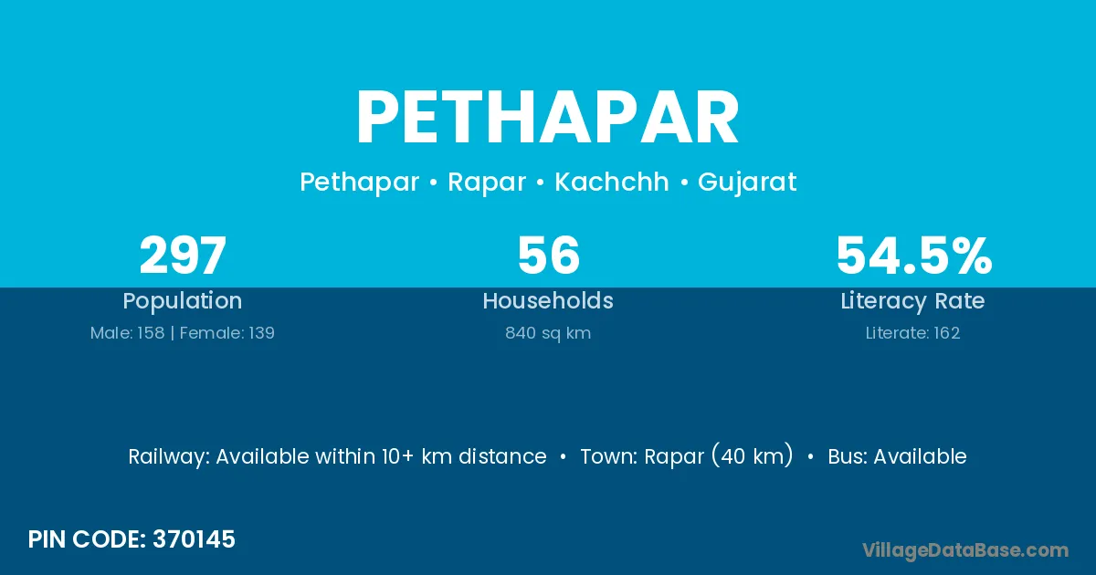 Rapar (40 km) is the nearest town to Pethapar village for major economic activities and is located approximately 40 km away.