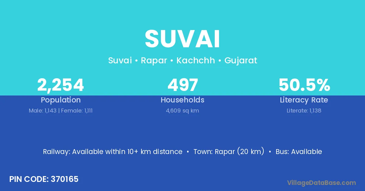 Rapar (20 km) is the nearest town to Suvai village for major economic activities and is located approximately 20 km away.