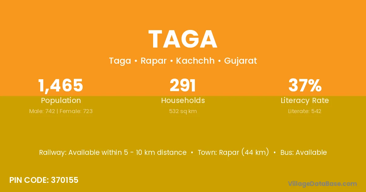 Rapar (44 km) is the nearest town to Taga village for major economic activities and is located approximately 44 km away.