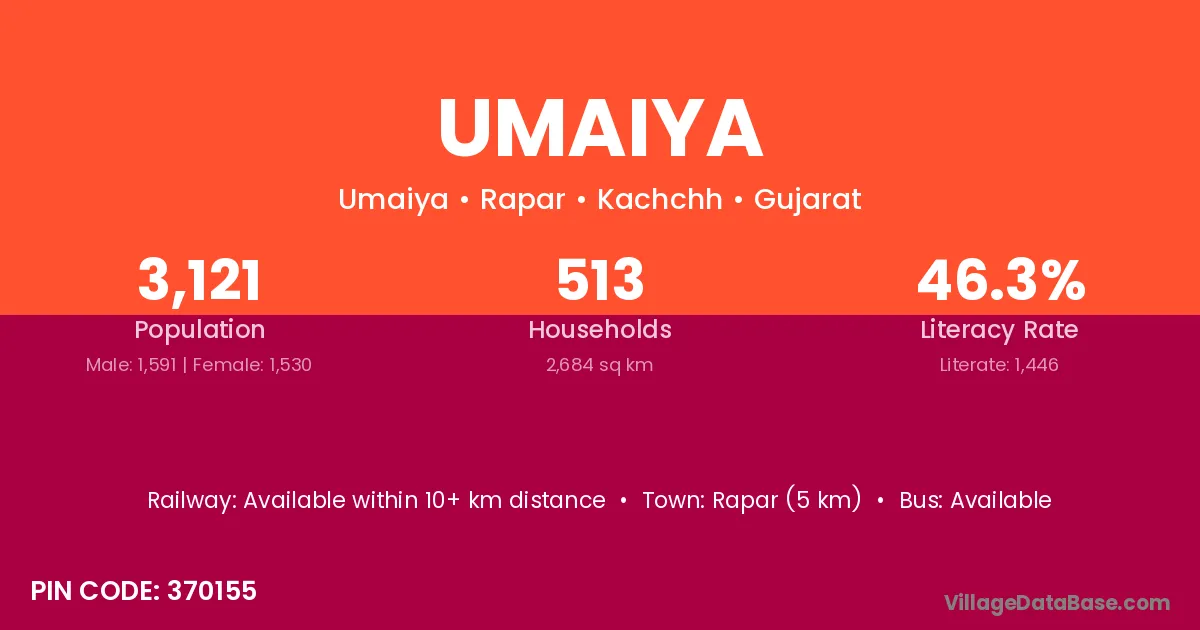 Rapar (5 km) is the nearest town to Umaiya village for major economic activities and is located approximately 5 km away.