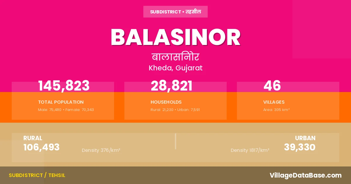 According to the 2011 census The total area of Balasinor Taluka is 305 km², with a population of 145823 people. The population density is 478 inhabitants per square kilometre, and there are approximately 28821 houses in the sub district.