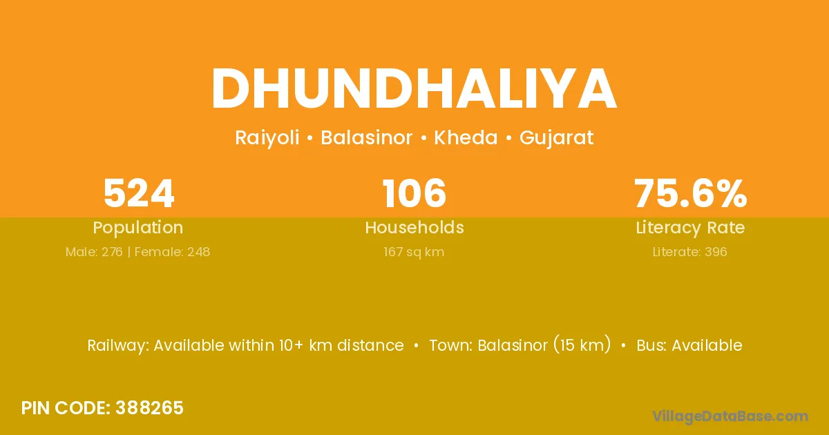Balasinor (15 km) is the nearest town to Dhundhaliya village for major economic activities and is located approximately 15 km away.