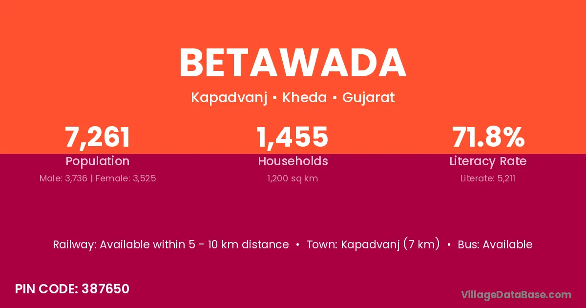 Kapadvanj (7 km) is the nearest town to Betawada village for major economic activities and is located approximately 7 km away.