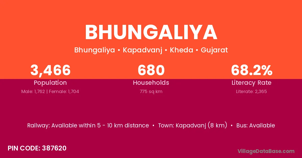 Kapadvanj (8 km) is the nearest town to Bhungaliya village for major economic activities and is located approximately 8 km away.