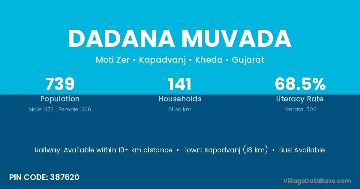 Kapadvanj (18 km) is the nearest town to Dadana Muvada village for major economic activities and is located approximately 18 km away.