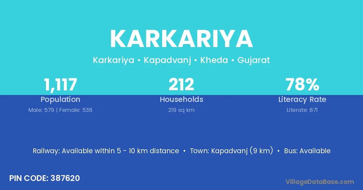 Kapadvanj (9 km) is the nearest town to Karkariya village for major economic activities and is located approximately 9 km away.