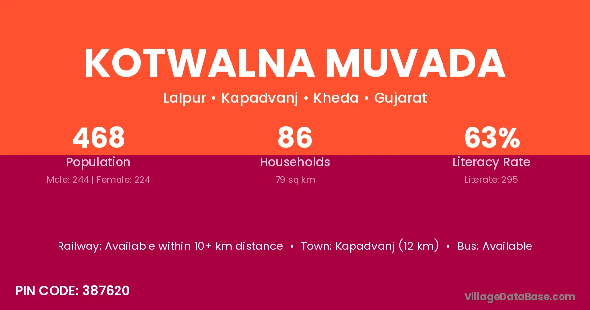 Kapadvanj (12 km) is the nearest town to Kotwalna Muvada village for major economic activities and is located approximately 12 km away.