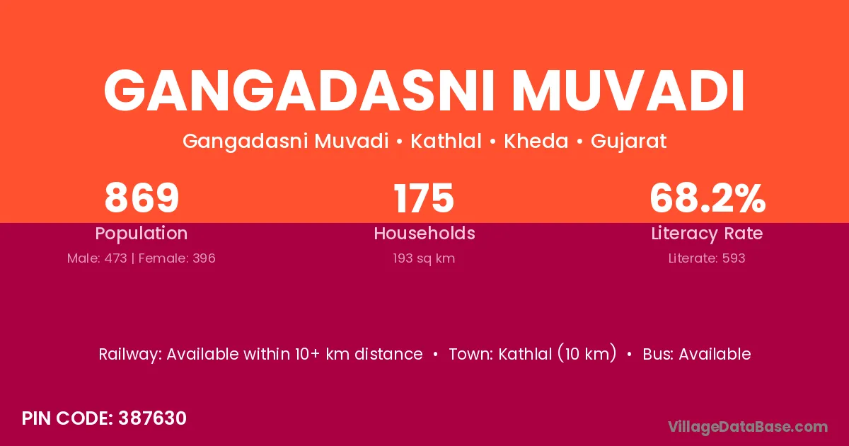 Gangadasni Muvadi village has a total population of 869 people, of which 473 are males and 396 are females.