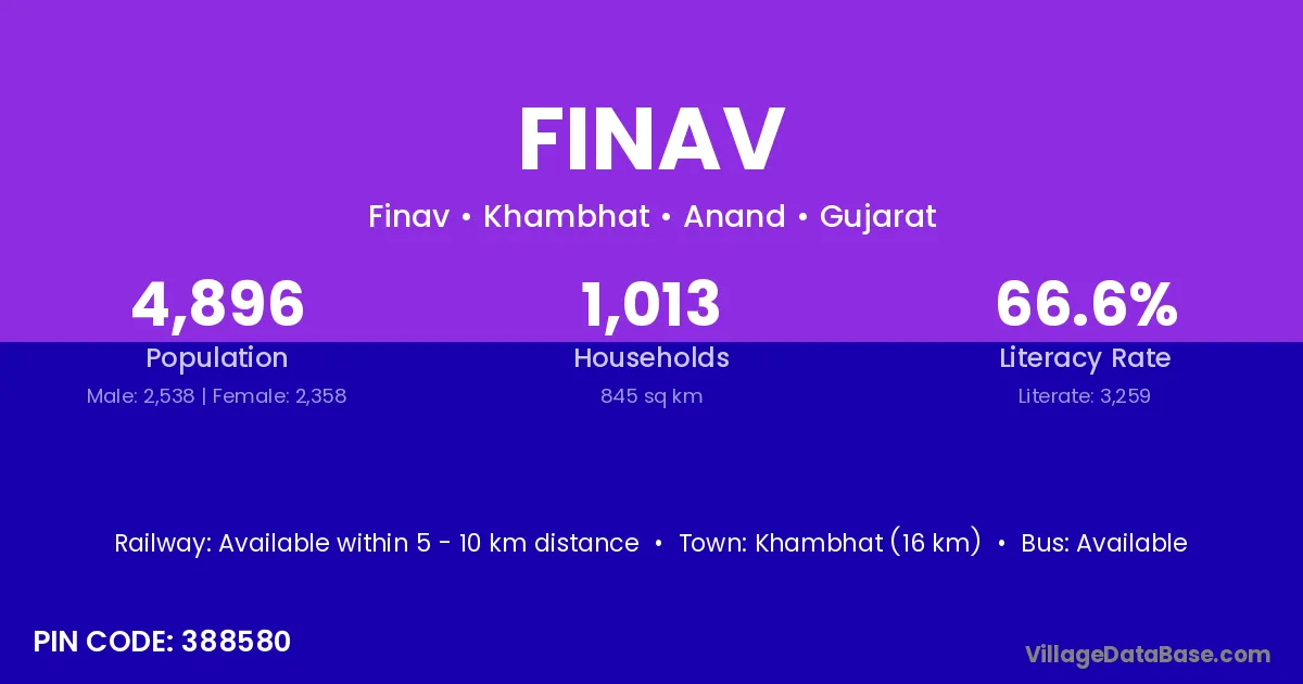Mahudha (1 km) is the nearest town to Finav village for major economic activities and is located approximately 1 km away.